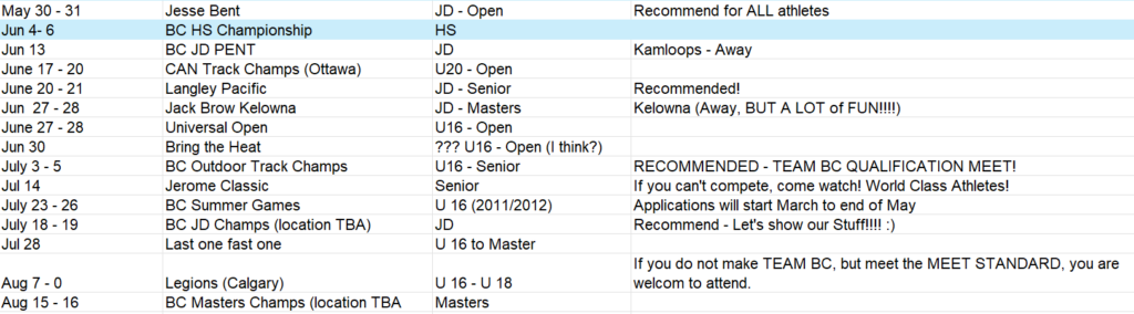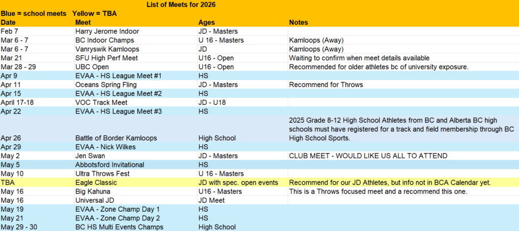 These are the 2026 meets that our Valley Royals Throws athletes can consider depending on their age and level. All athletes should speak to their coach(es) before registering for any of these meets.